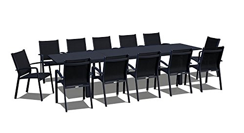 Moving on to the 13 piece large outdoor dining sets, we’ve got this super sleek black patio dining set by Urban Furnishing that has a beautiful simplicity to it while also being comfortable and versatile. It’s available in black (pictured) and as a white outdoor dining set as well, with both versions consisting of 12 armchairs plus 1 extendable glass top table. While the table’s 86.6″x36.2″ (length x width), it can extend up to a huge 130″ of length in a smooth and simple motion. The chairs have a modern look, like the table, and are very comfortable due to their woven polyester body plus they have a stacking design as well, making them easy to store. The frosted glass table top makes this set quite stunning and classy even with its minimal design. When it comes to durability, every single material used is weatherproof and robust, from the rustproof aluminum frames to the polyester, ensuring that it can resist both use and weather. It’s also easy to assemble and comes with a 3 year warranty. It’s ultra modern, effective and for a 13 piece dining set it’s quite affordable.