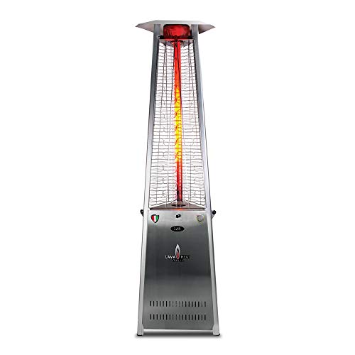 Another excellent entry from Lava Heat Italia, this model gives you their trademark quality and performance in a 6.5 ft tall cylindrical model that comes with a remote control and an incredibly long 10-year warranty, ensuring its top spot as on my personal list of the best propane patio heaters I’ve ever tested. It’s 81” tall and 33.5” wide with an overall weight of 60 pounds. It’s a more manageable unit since it’s not as big as the previous one and is also easier to move. It puts out a maximum of 51,000 BTUs which perfectly heats a diameter of 10 feet around it and you can control the flame with 3 predefined settings. The electronic ignition ensures an effective startup and the remote control gives you the ability to sit back, relax and use it comfort. The base opens up and has enough space to use a 20 lb propane tank which gives you around 10 hours of non-stop use at high-heat. The classic flame column is in full, gorgeous display and as usual it has a protective steel grill around it to ensure your safety. There are several finishes available, from the heritage bronze shown to stainless steel and more. It also features a safety tilt automatic shut off feature, further protecting you and your patio. I got this model after a long time of eyeing it and I’ve gotta say it’s worth it!